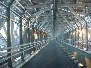 やって来ました「しまなみ海道」四国から出発して今治ICをとうり来島海峡SAからH11.5完成の来島海峡大橋を見る。 橋を渡る車の下をフェリーがゆっくりとした時間で過ぎて行く・・・ |