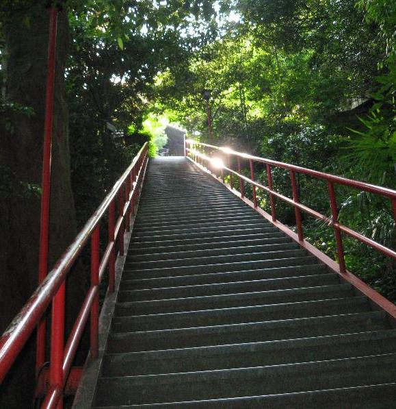 有料道路を登り中腹の駐車場から歩く。下車して写真左から入り写真右の108段(煩悩)の階段から反省は始まる。 | |