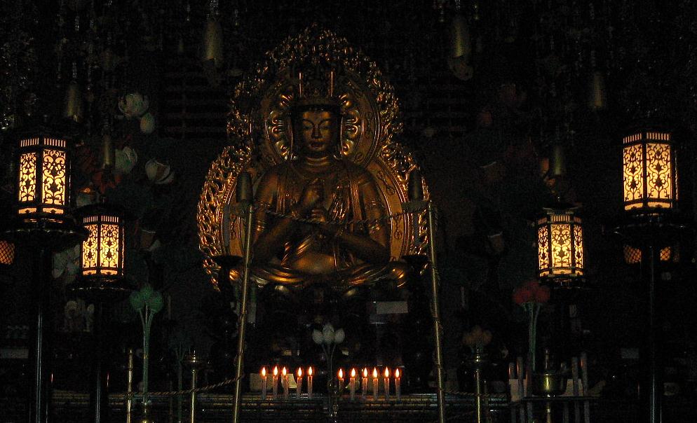 2Fのご本尊。土足禁止の中でお祈り用の椅子が数多く並ぶ。